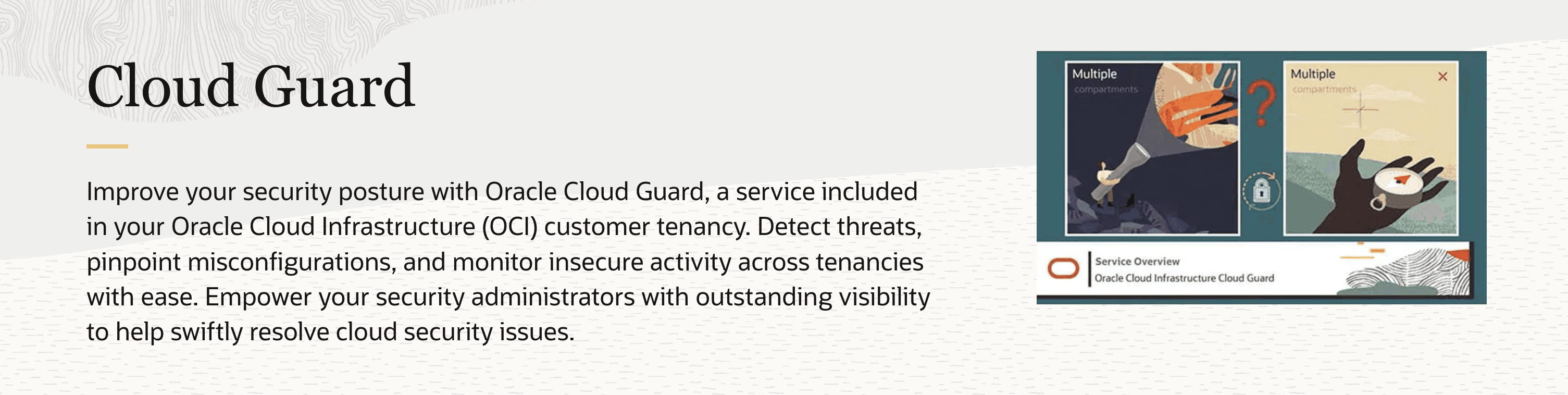 Oracle Cloud Guard is the central security service within Oracle Cloud Infrastructure (OCI), enabling users to detect threats, automate remediation, and monitor compliance posture at scale. Paired with Vulnerability Scanning Service (VSS)—which performs continuous CVE analysis across workloads and containers—these tools form a critical part of Oracle’s cloud security offering.